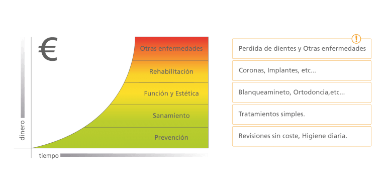 ¿5 minutos cada 6 meses? Es el tiempo que tardas en realizar una revisión bucodental GRATUITA en Zen dental. Esperar a tener dolor en alguna pieza incrementa las posibilidades de necesitar un tratamiento mas costoso. (gráfico económico progresivo)